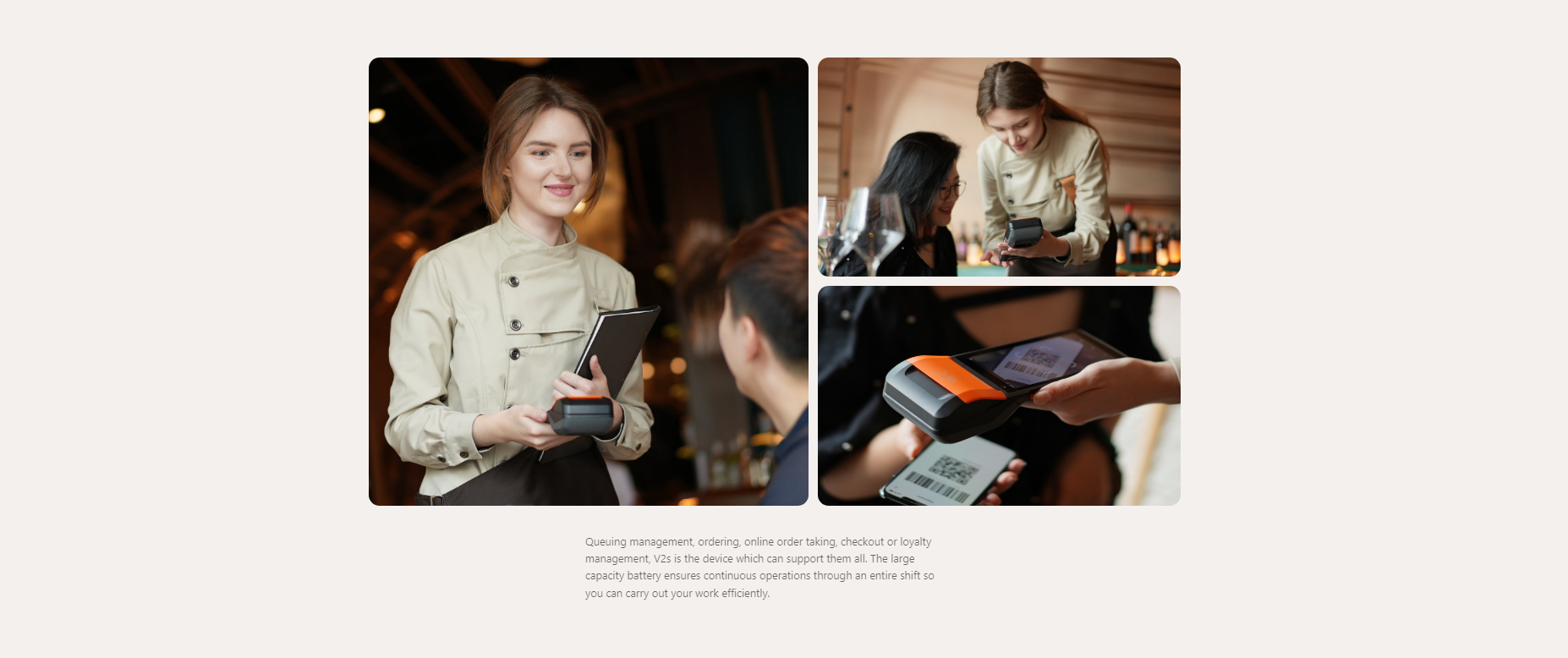 Queuing management, ordering, online order taking, checkout or loyalty management, V2s is the device which can support them all. The large capacity battery ensures continuous operations through an entire shift so you can carry out your work efficiently.
