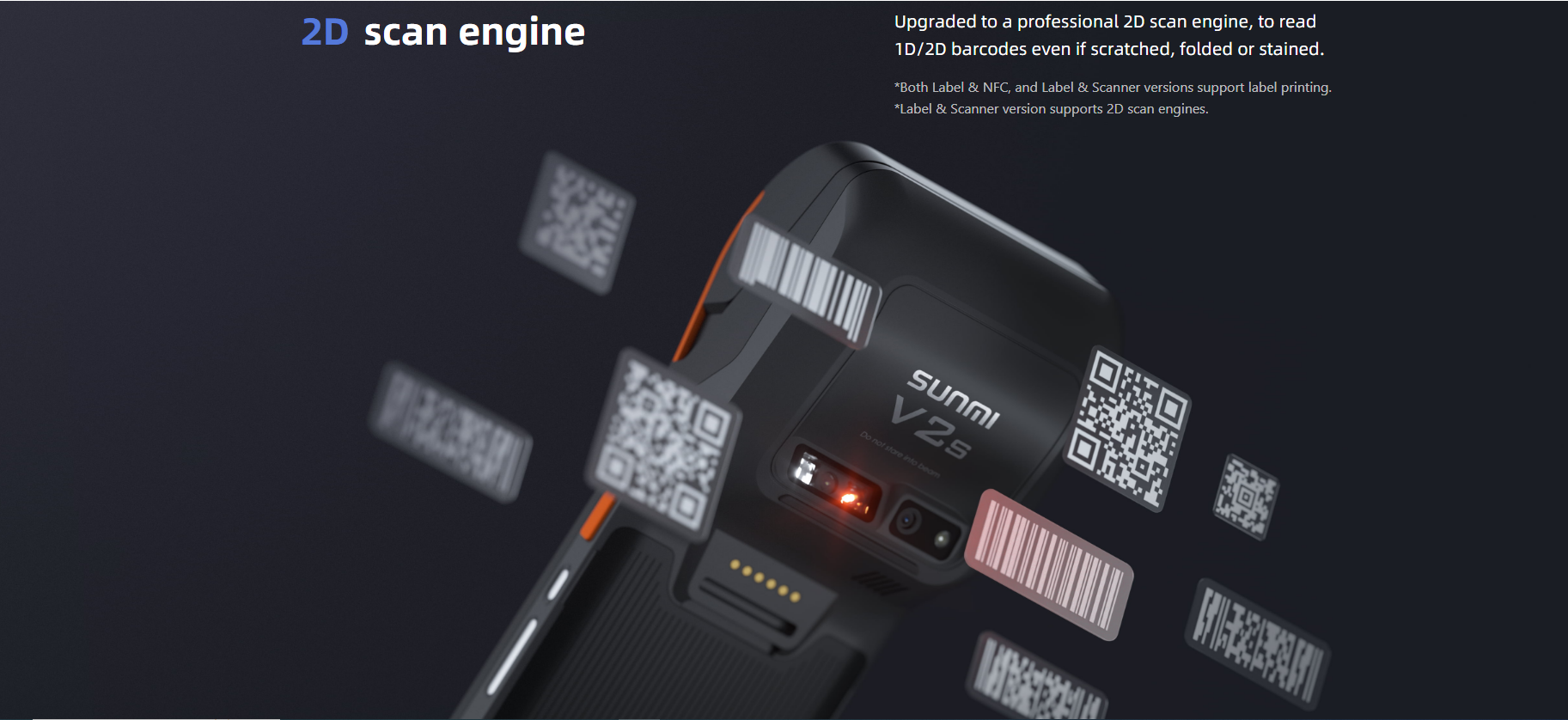 Upgraded to a professional 2D scan engine, to read 1D/2D barcodes even if scratched, folded or stained.